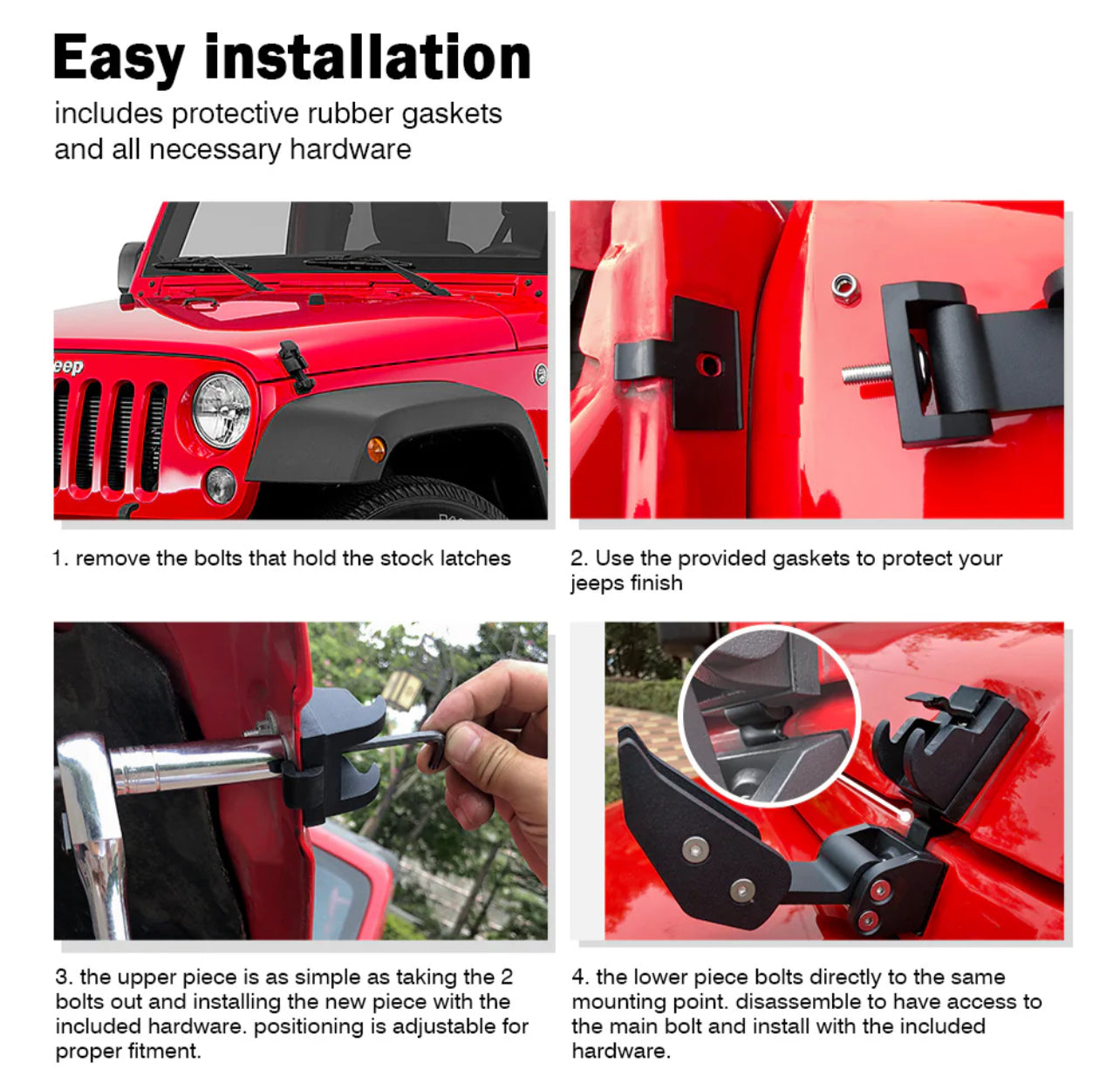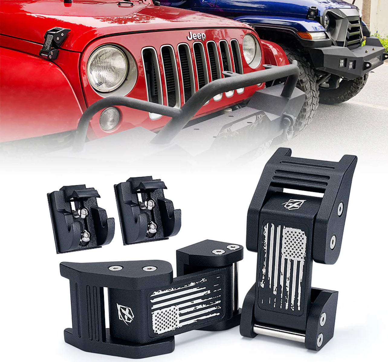 Enhance your Jeep with Rugged, Heavy Duty Hood latches that boosts Offroad styling. Catered to fit a JK, JL, JT, and easy to install with no drilling or modifications required.